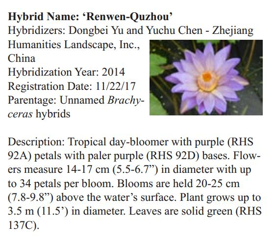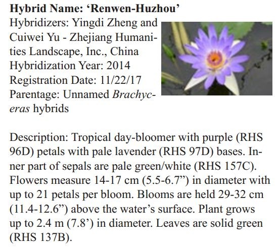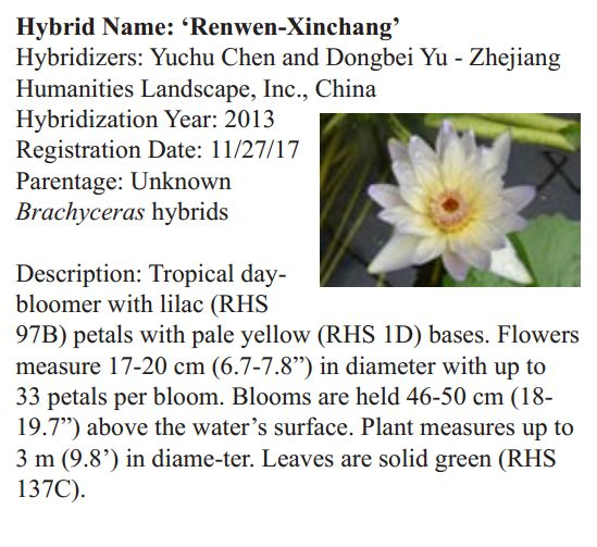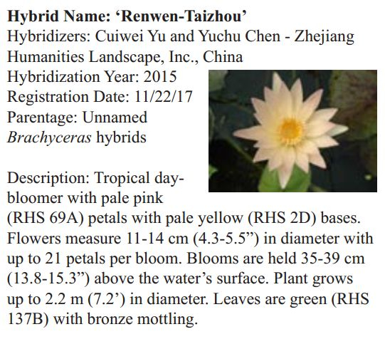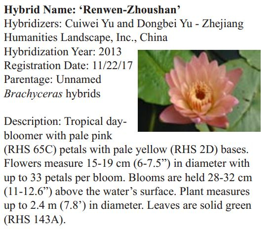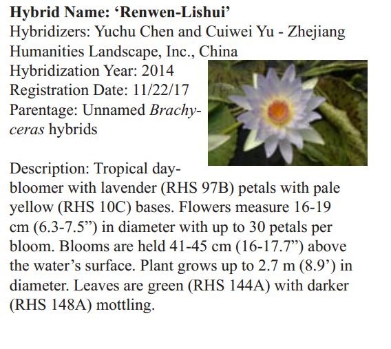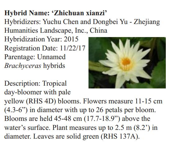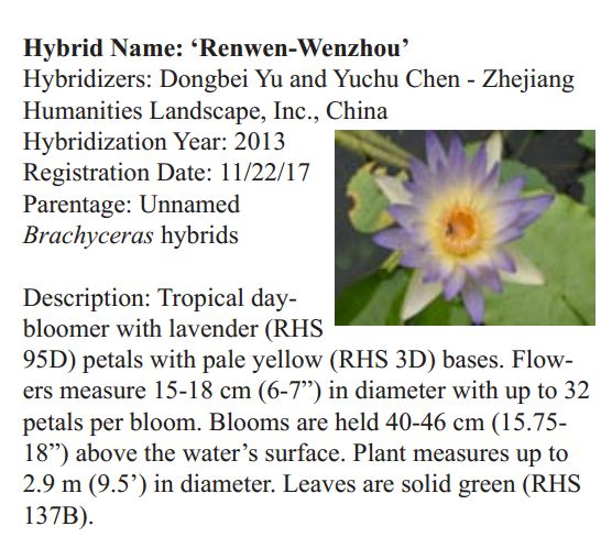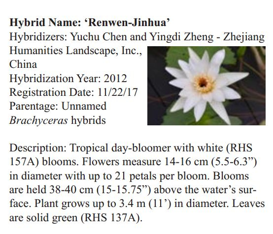 2018年1月19日,人文園林副總裁陳煜初收到美國《Water Garden Journal》雜志社Kathy發(fā)來的電子版IWGS Water Garden Journal Winter 2017-18。雜志報(bào)道了人文園林睡蓮屬國際登錄的10個(gè)新品種,蓮屬國際登錄的8個(gè)新品種,共計(jì)18個(gè)。加上此前獲得的新品種國際登錄,目前人文園林總共擁有20個(gè)睡蓮屬新品種國際登錄、35個(gè)蓮屬新品種國際登錄和1個(gè)鳶尾國際登錄。