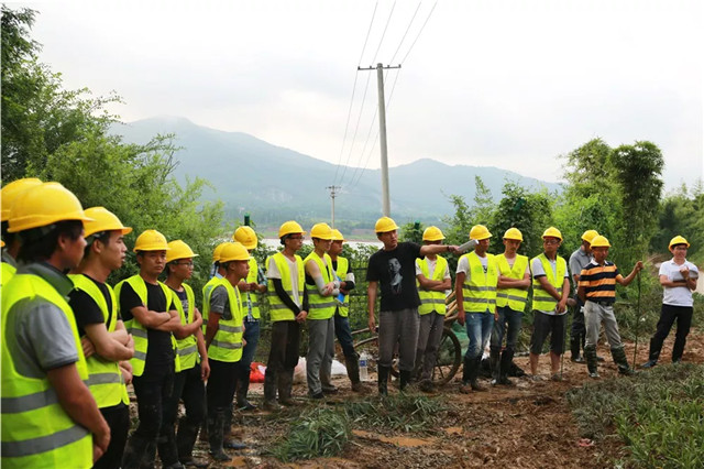 施工方案的討論及確定、場地的整理、隊伍的磨合費去了不少時間。第二天傍晚突然下起了雨,為了趕工期,大家冒雨作業,一刻也不停歇,直到殘蟬噪晚、夜幕降臨。