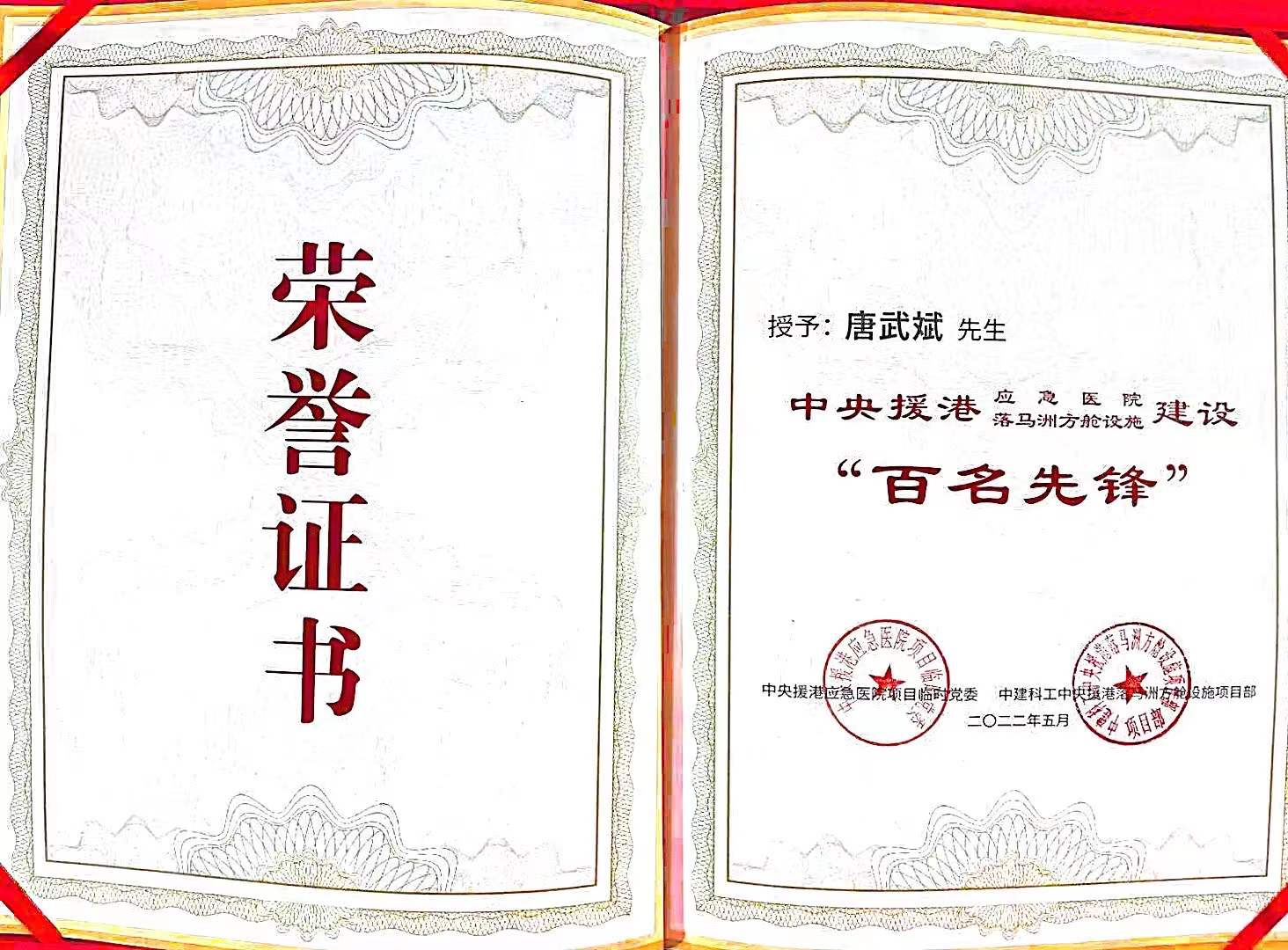 人文園林項目總經理唐武斌獲得了“百名先鋒”建設獎章