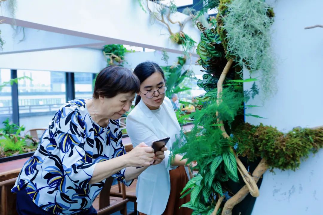 參會的專家顧問及副主任委員們還參觀了人文園林位于屋頂的花園。雖然杭州進入了炎熱的夏季,但花園內依然綠意盎然,行走在其間仿佛置身于雨林中。這里同時作為植物品種收集種植觀測區,現已種植植物品種約400多種,其中包括睡蓮、鳶尾、蘭花、杜鵑、紫藤等人文園林特色植物。
